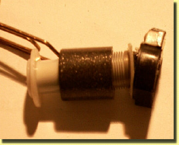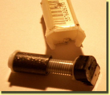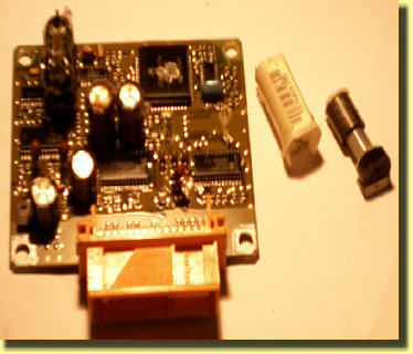 Leiterplatte mit ausgebautem und geöffnetem Auslösemechanismus (rechts daneben). Der Auslösemechanismus ist in der weißen Schutzhülle fest versiegelt. Dieser konnte hier nur durch Zerstörung geöffnet werden.
